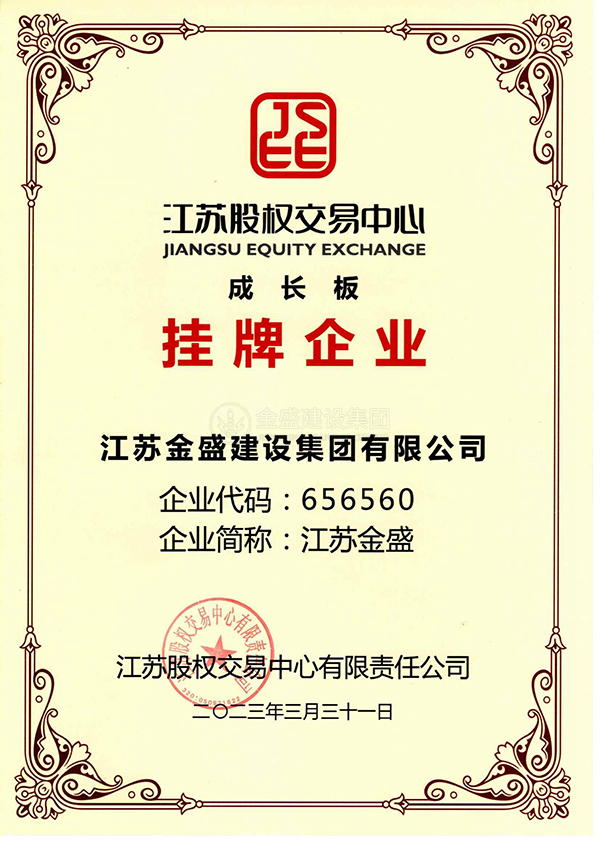 • 江蘇股權交易中心成長板掛牌企業資質證書